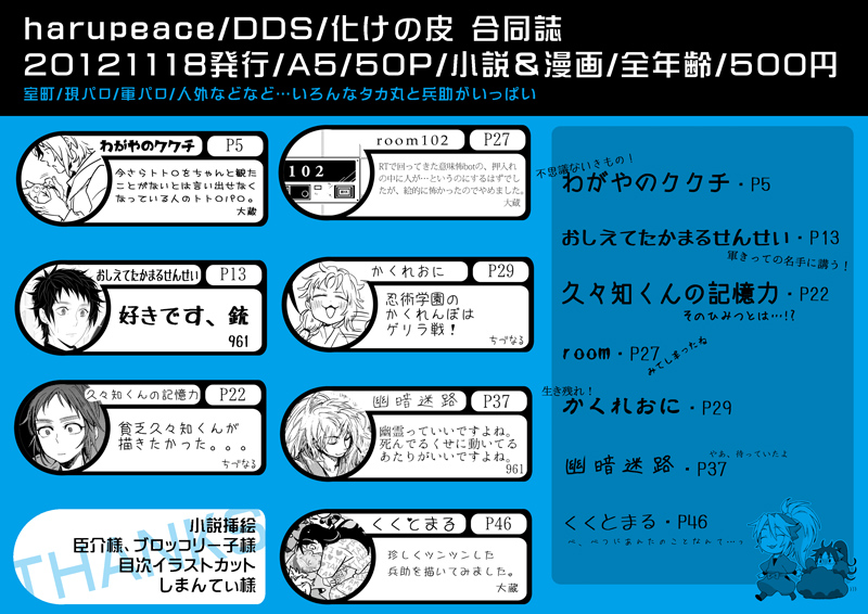 harupeace・化けの皮・DDS なんでも有りな人向け合同誌 『くくまる』 ●A5/50P/漫画+小説/全年齢 ●現パロ・年齢操作・転生・人外等、いろいろなタカ丸と兵助がいる短編集 ●イラストゲスト様あり サンプル |