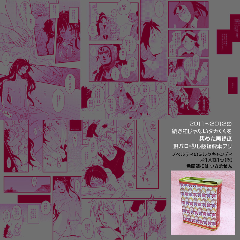 『DDS001』 ■A5/100P/R-18 ■タカくく(一部藤綾絡みます)の一部再録本 ■ギャグ・シリアス・18禁・下ネタ・公式ネタ・現パロ・ホラーなどなど 再録一覧 R18注意 サンプル(ノベルティ終了) |